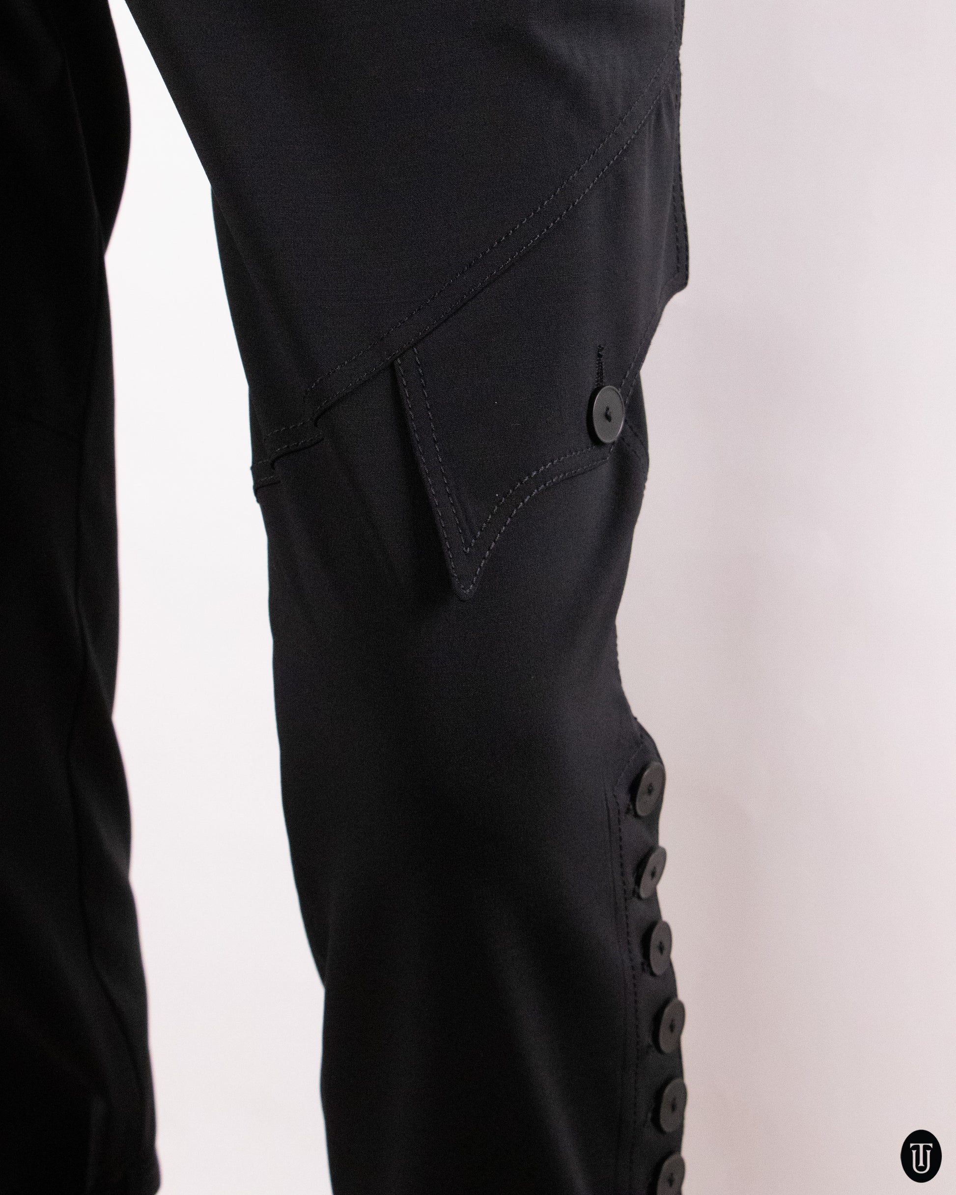 These 2000s Jean Paul Gaultier Femme trousers, made in Italy, are crafted from a refined wool-blend. The fabric holds its shape cleanly while allowing ease of movement, reflecting Gaultier’s precise approach to tailoring. Cut with a low-waisted rise, they sit sharply on the hips and contour the leg with intention rather than stretch. Functional detailing and buttoned accents give the piece its distinctive utilitarian edge, grounded in material quality and careful construction.