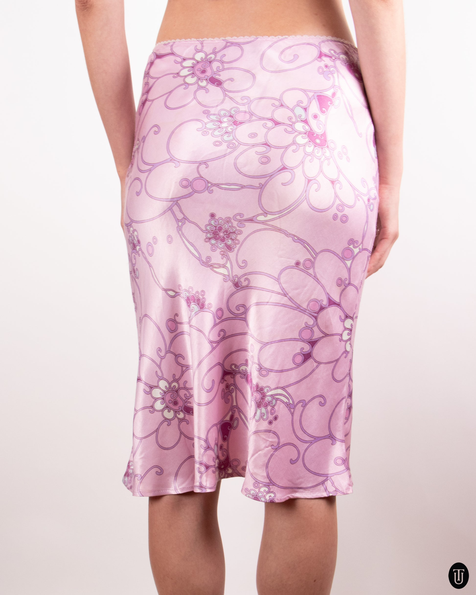 This early 2000s Sportstaff midi skirt exemplifies the era’s affinity for fluid silhouettes and feminine prints. Cut on the bias for a soft drape, it’s crafted from a slinky satin like fabric with a high-gloss finish that enhances movement and sheen. The abstract floral motif and the delicate picot trim at the waist evoke effortless elegance with a playful, nostalgic edge.