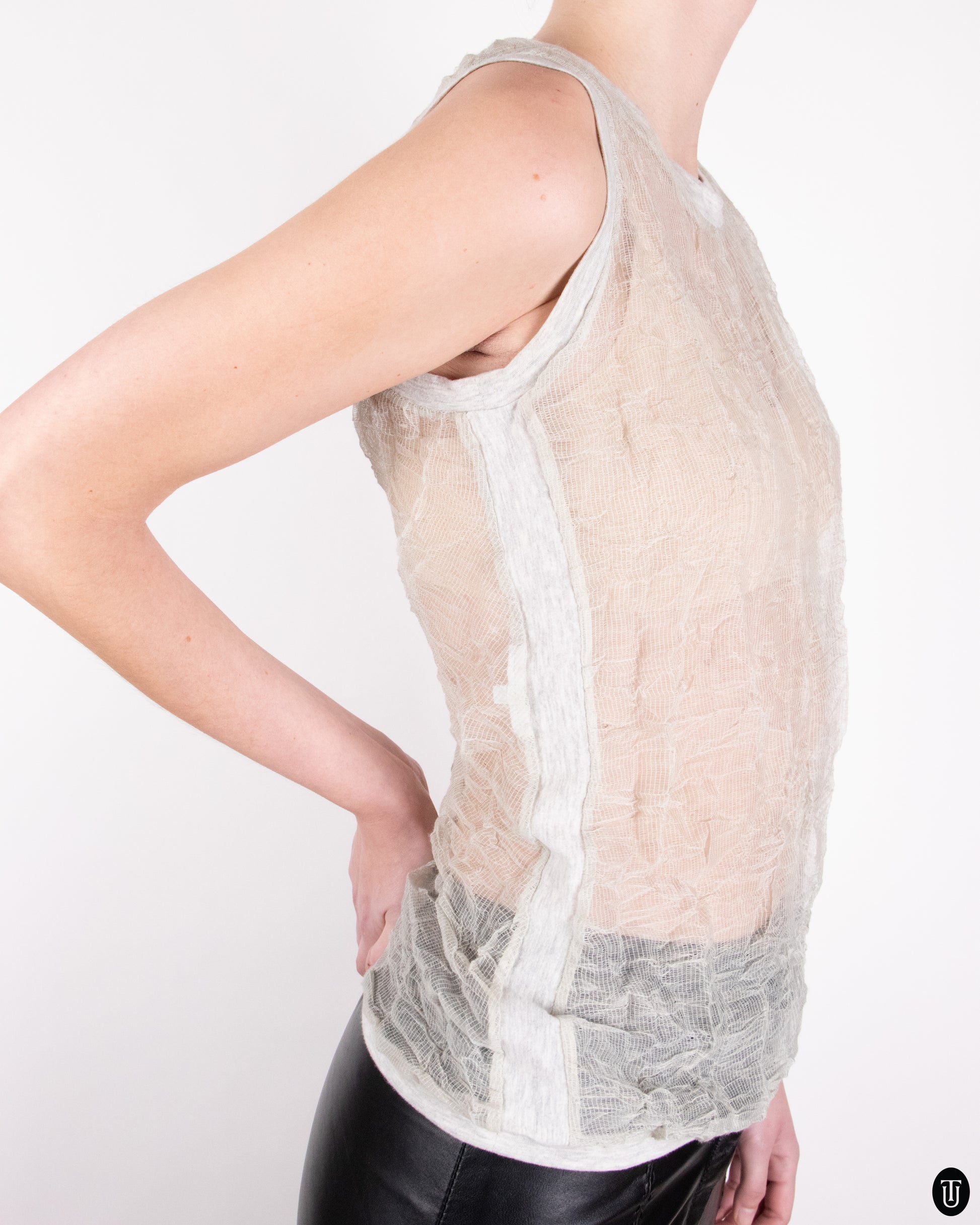 This late 1990s Helmut Lang tank top exemplifies the brand's minimalist, deconstructed ethos. Crafted from sheer, crinkled mesh with raw-edged finishing, it channels a weightless, ethereal quality while subtly referencing industrial textures. The layered construction—gauzy overlay atop a muted base—creates visual depth, enhancing the garment’s sculptural silhouette.