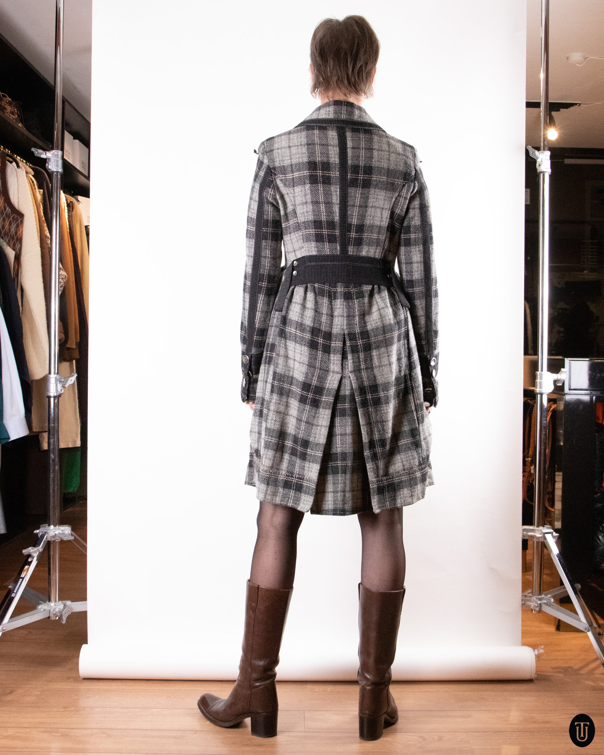 This early 2000's Marithé + François Girbaud plaid jacket is crafted from a mid-weight wool fabric and falls just below the knees. The wool has slight metallic detailing to it giving the plaid print a more edgy look. In true fashion to the house's legacy the jacket features a lot of detailing, asymmetrical pockets, a-line coat hem and big buttons along the cuff, giving new life to an otherwise standard closet piece.