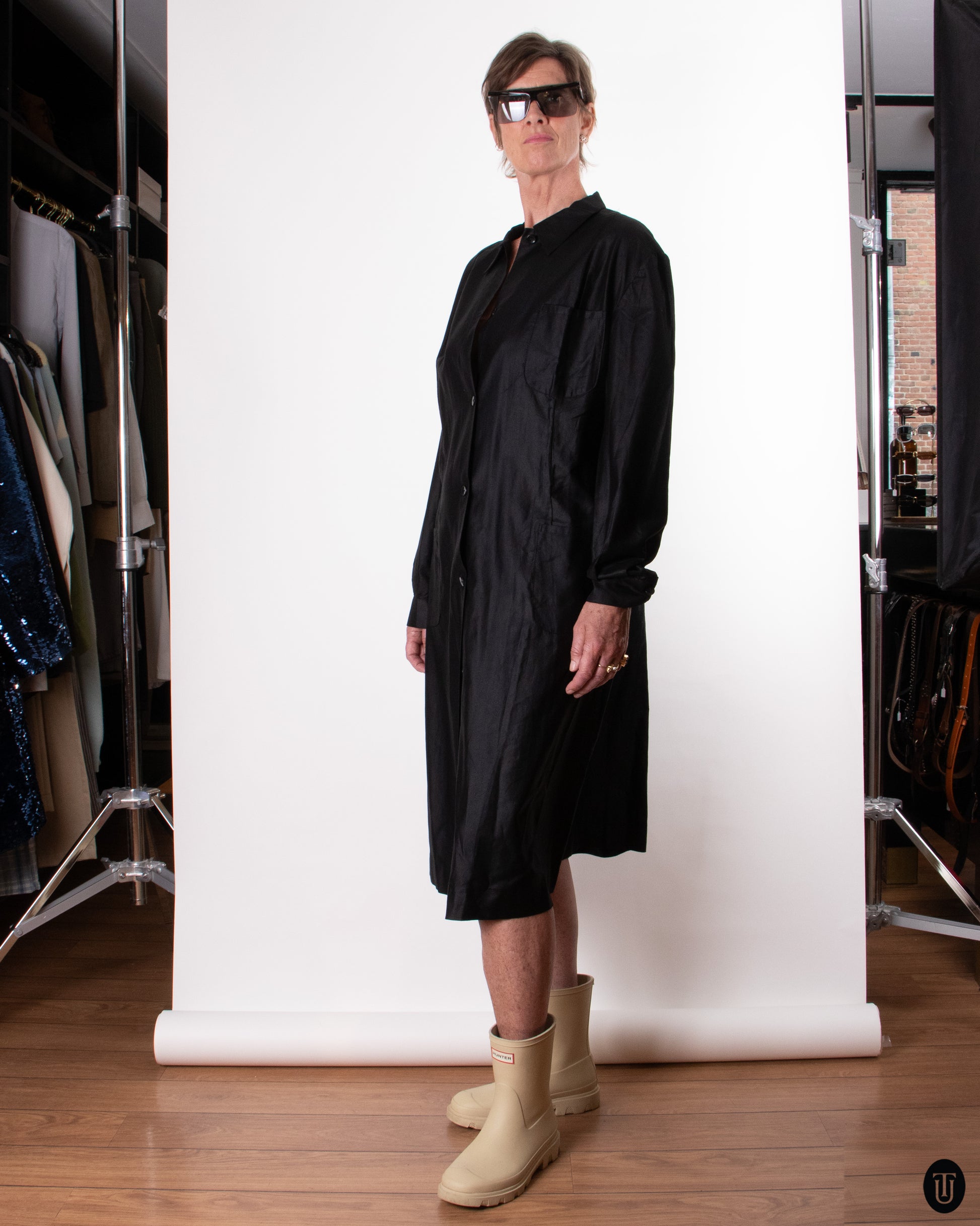 This 1990's long tailored jacket is by vintage Milanese brand Fraizzoli & co. It is constructed from a light weight sports like fabric, and is quintessential 90's minimalism. The jacket features a shirt collar neck line, cuffed sleeves, and symmetrical oversized pockets along the hip line. Finished with an a-line fit and falling just below the knee's, it is the perfect coat for fall layering.
