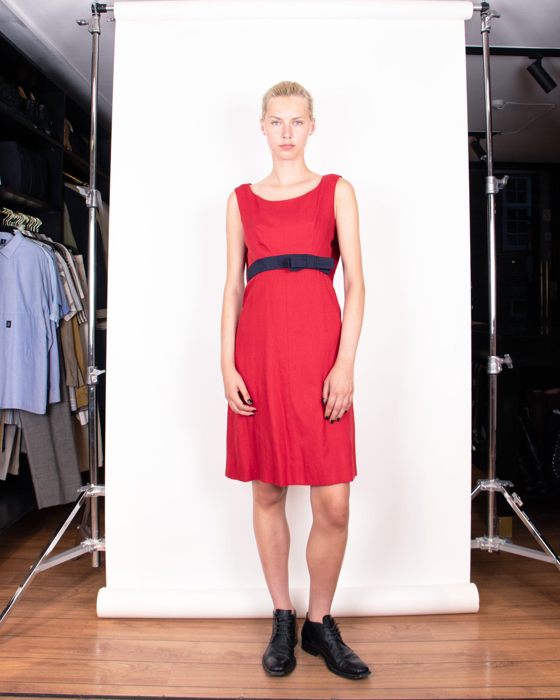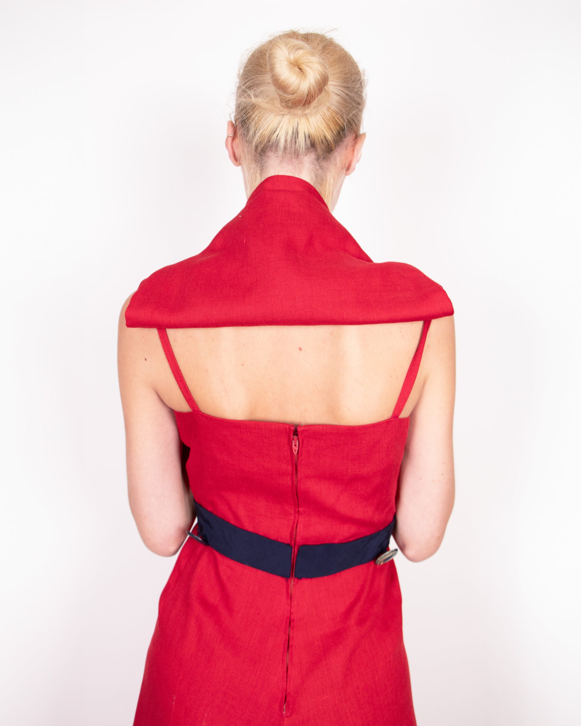 This 60s Nina Ricci dress, crafted from linen, features a simple yet elegant design with a vibrant rose color. The sleeveless cut and fitted silhouette emphasizes a timeless understated chic, while a navy blue hand-stitched belt with a bow detail at the waist adds a contrasting touch. A back cape attaches with two buttons on the back and adds a clever detail to this 1960s design piece.