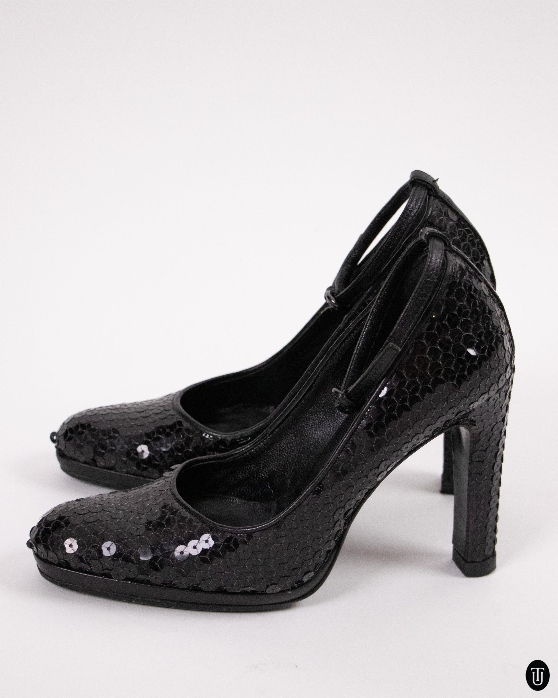 These FW2002 Miu Miu mary-jane style pumps are covered in black sequin, and feature a semi-round toe line. The heels sit comfortably at a 10cm height, and have an adjustable ankle strap for foot security. These heels are quintessentially what the fashion house was known for in it's early 2000's era.