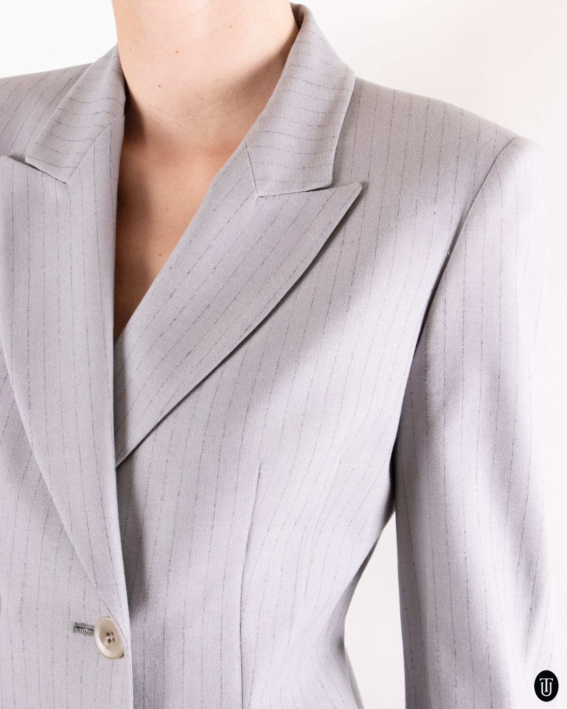This Gianfranco Ferre suit is quintessential 90's power dressing. From the highwaisted cigarette trousers, to the strong classic lapel and double breasted buttoning is an ode to the 1990's office core. The light gray, thin pin stripe suit is crafted from a light weight wool blend, making it suitable all year round.